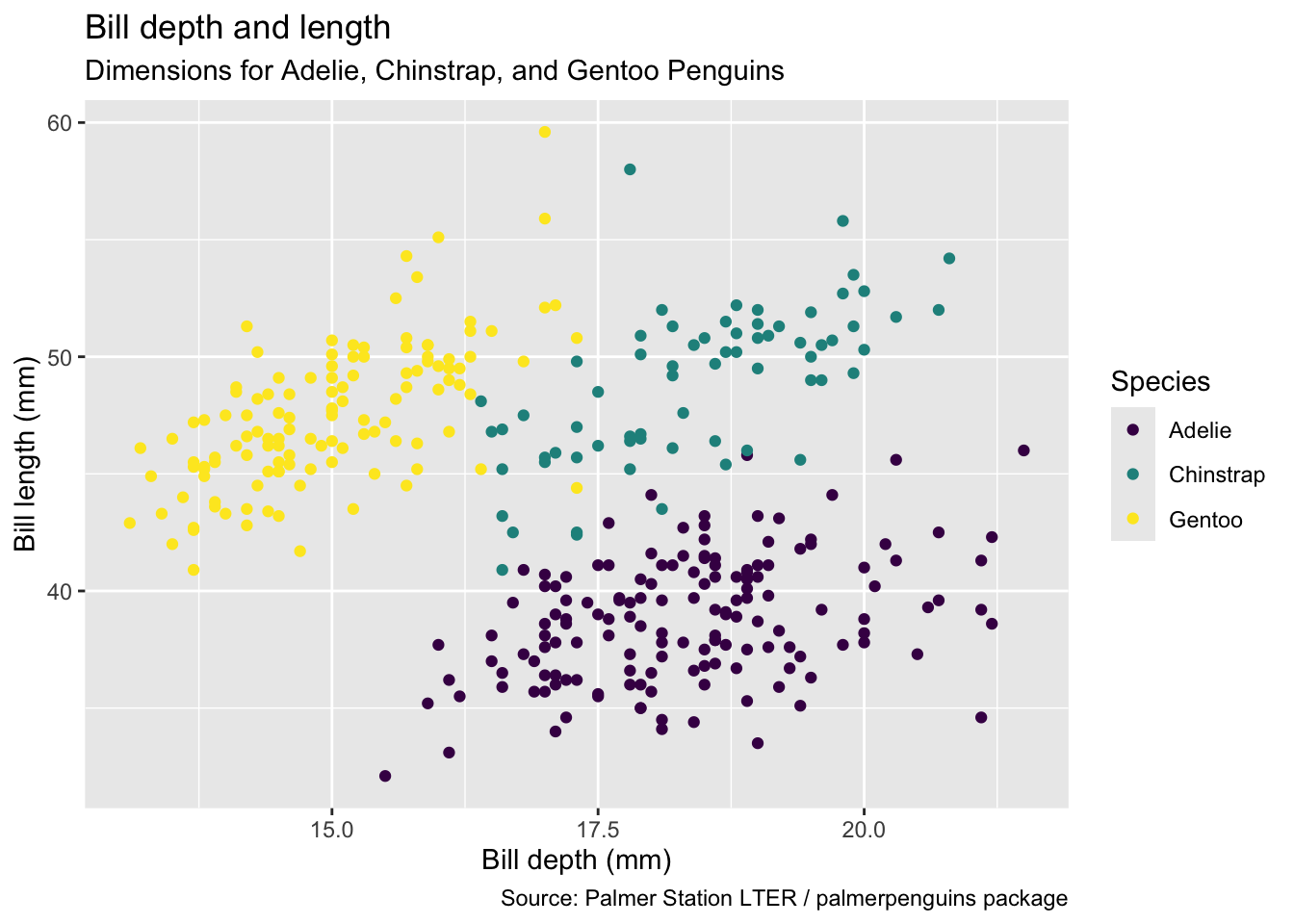 x = "Bill depth (mm)", y = "Bill length (mm)",