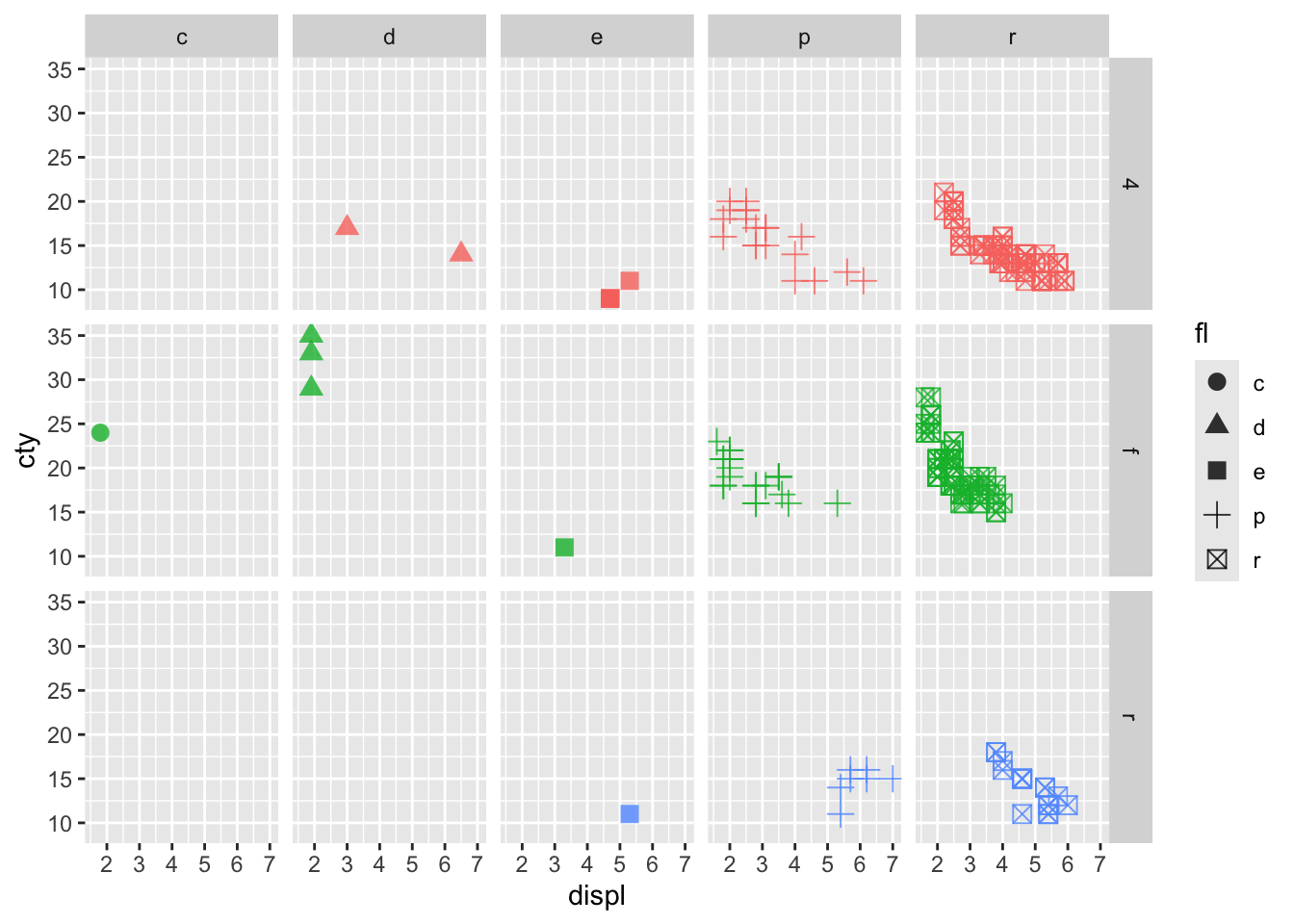 mpg |> ggplot(mapping = aes(x = displ, y = cty, color = drv, shape = fl)) +