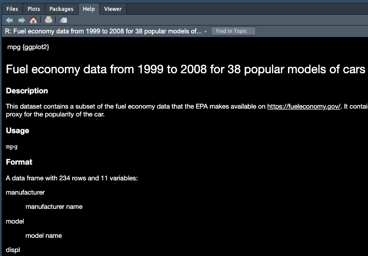 ggplot2::geom_point()? followed by the data name or function name like?mean