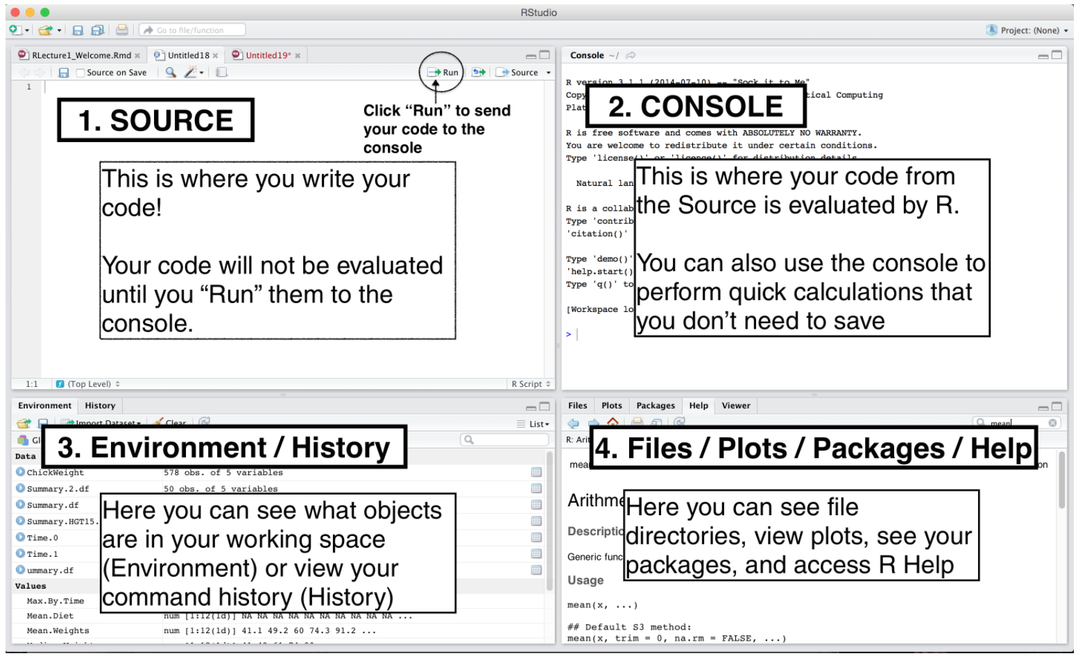 In the Console pane, write R code: a string "Hello WoRld!" or math 2 + 4.