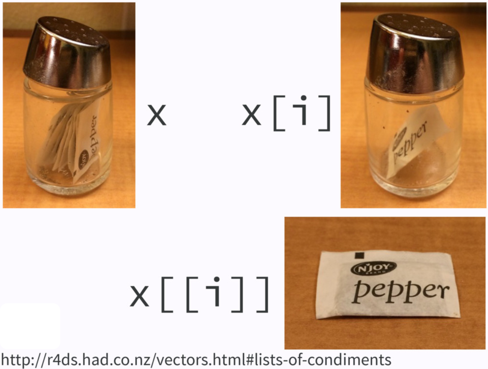 xis a train carrying objects, thenx[[5]]is the object in car 5;x[4:6]is a train of cars 4-6.โ @RLangTip, https://twitter.com/RLangTip/status/268375867468681216