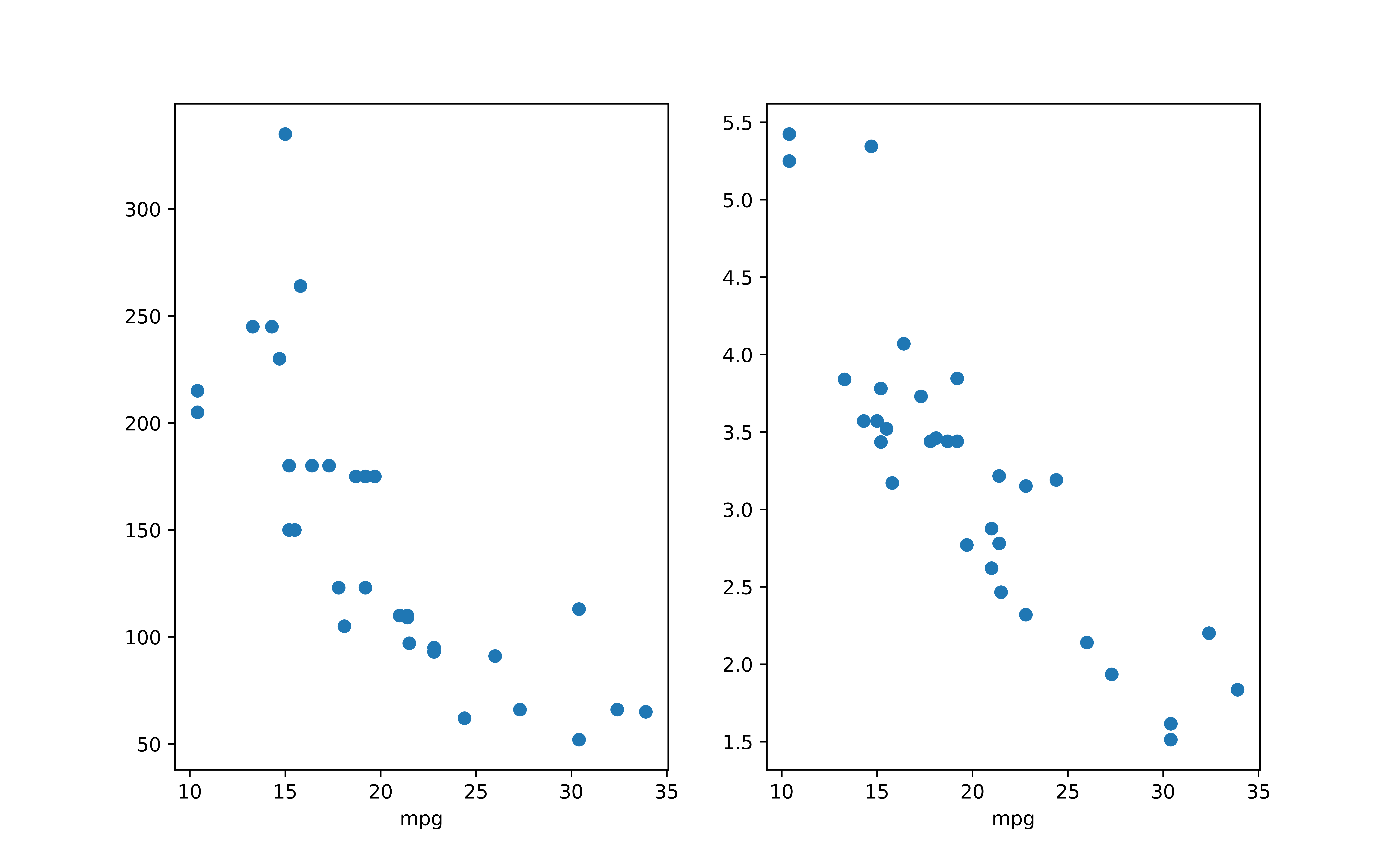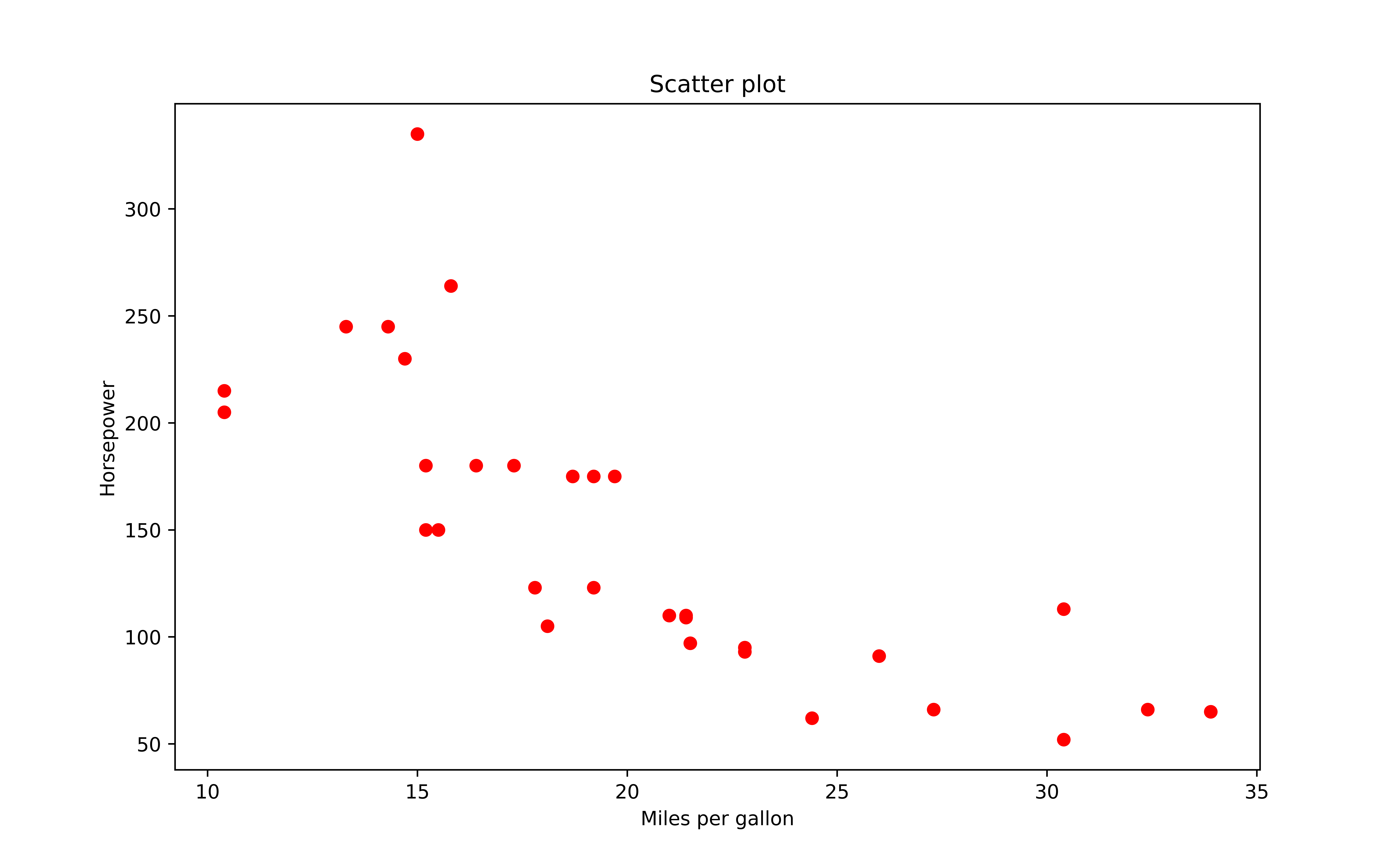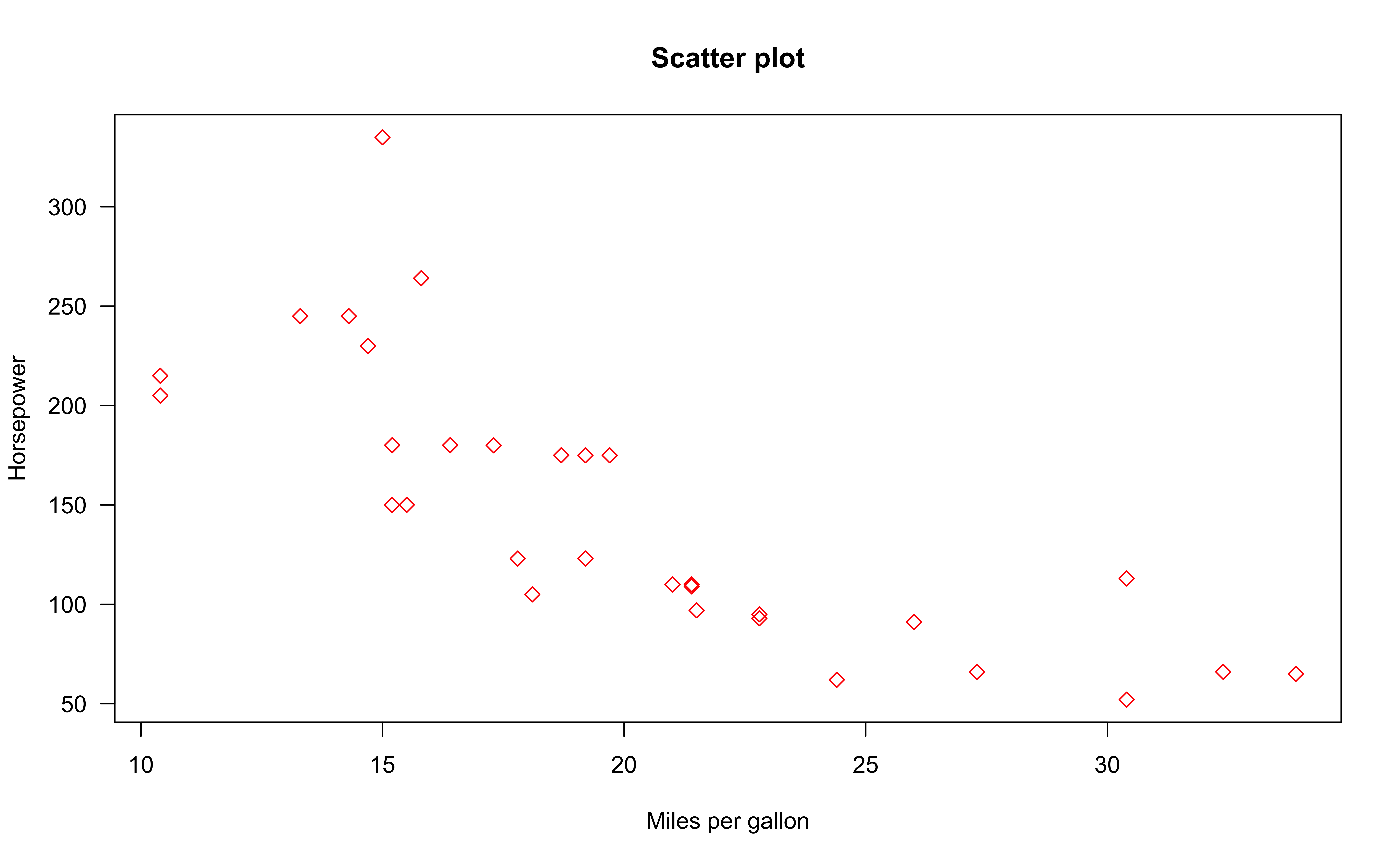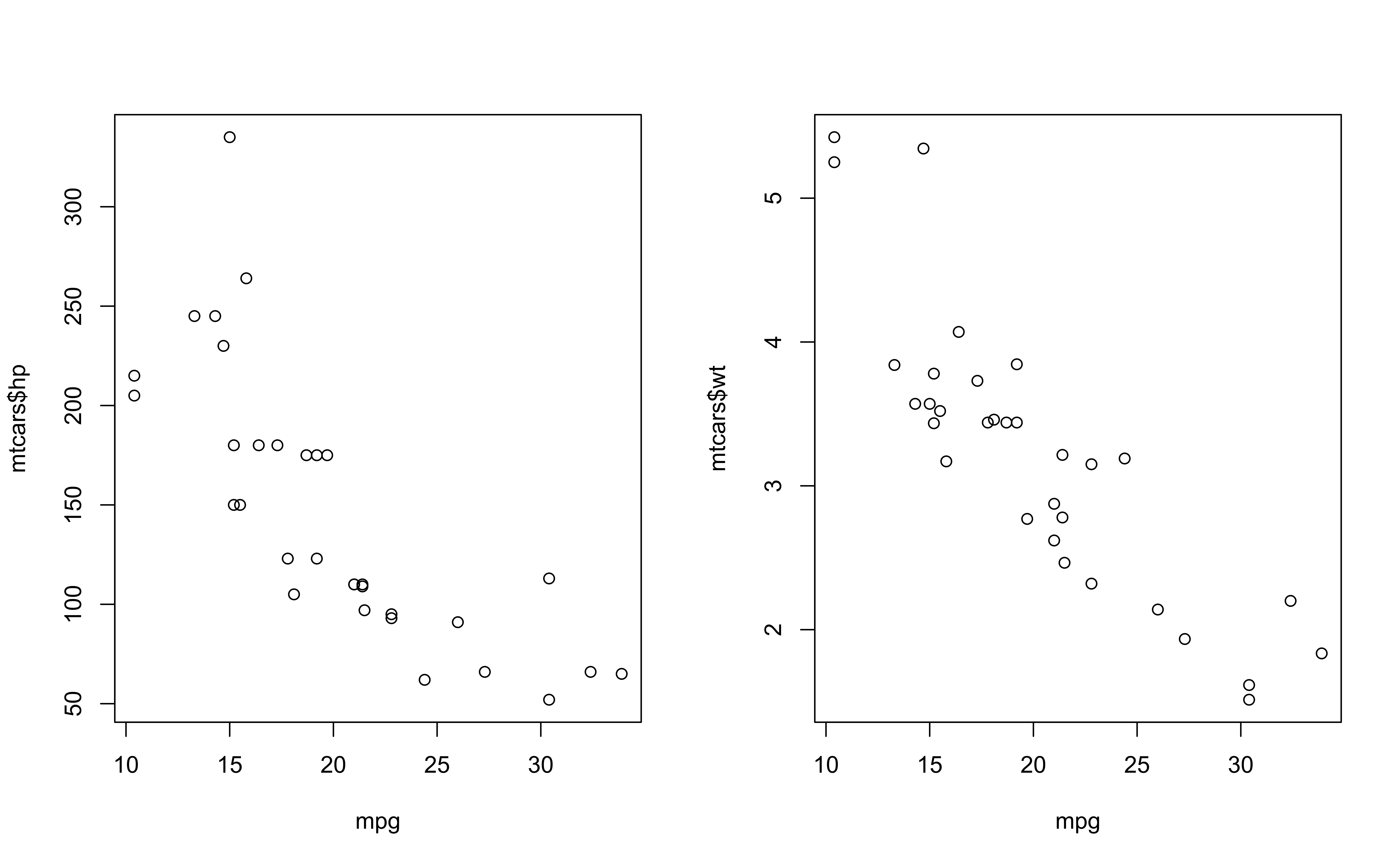 plot(x = mtcars$mpg, y = mtcars$hp,