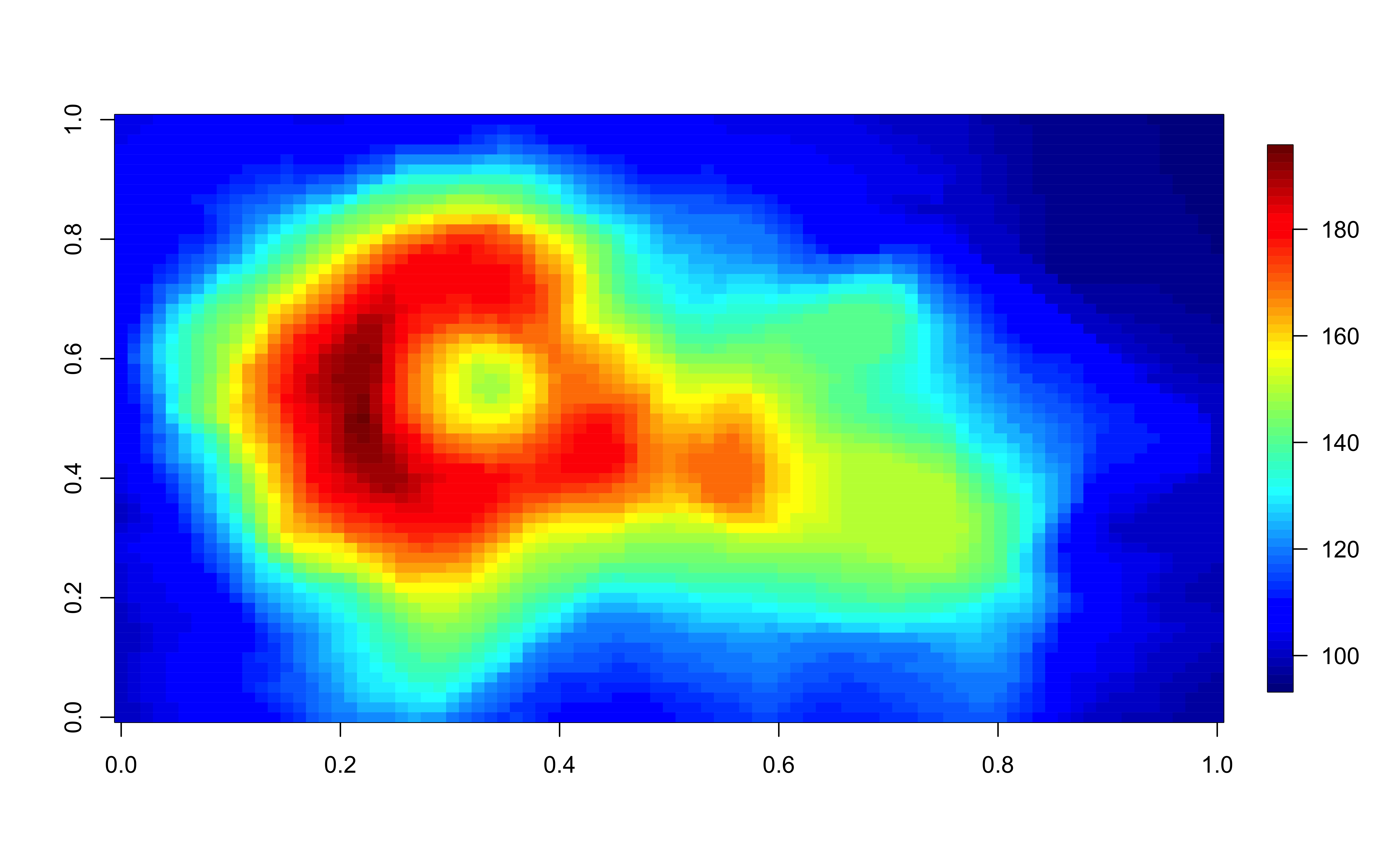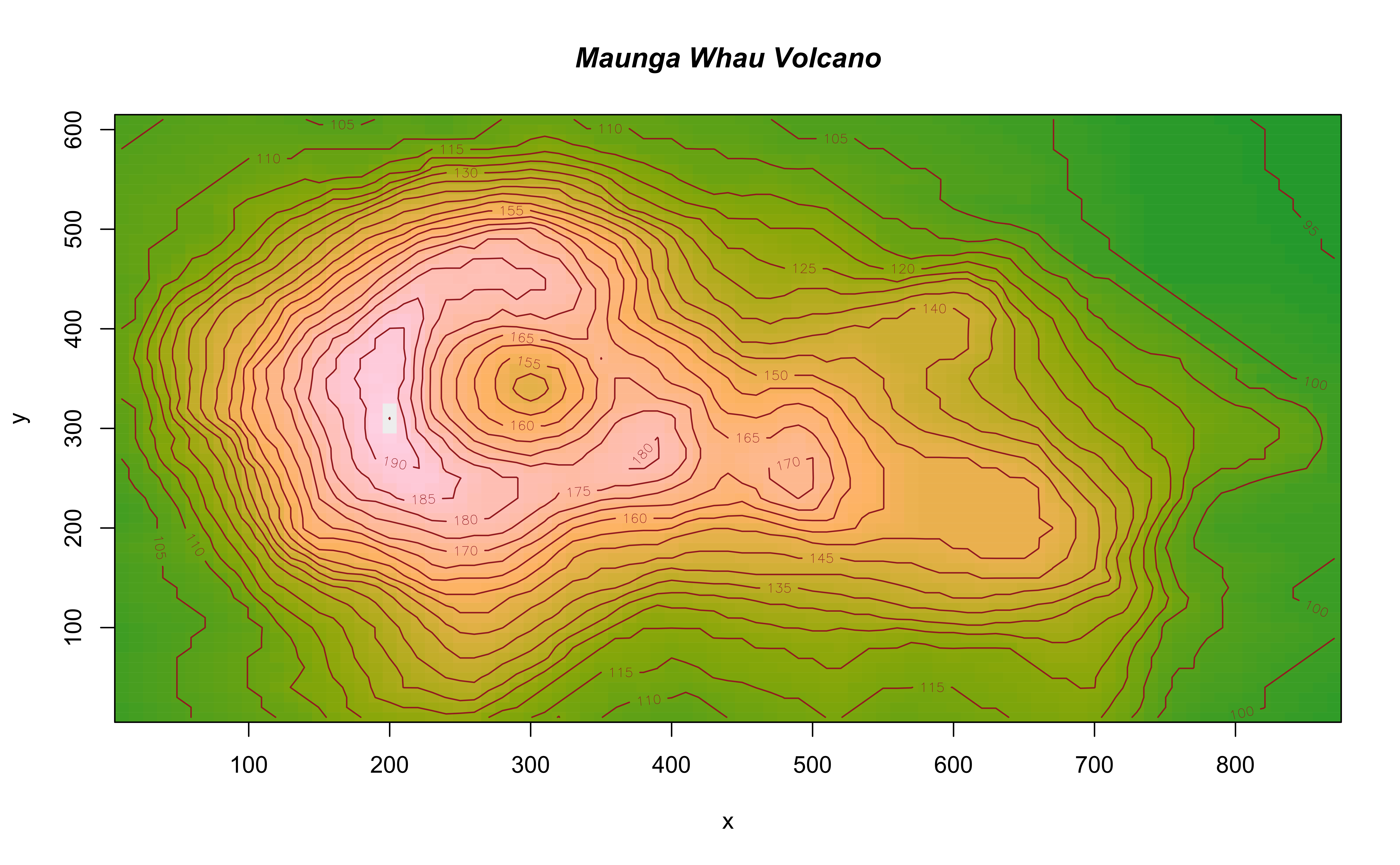image.plot(volcano) num [1:87, 1:61] 100 101 102 103 104 105 105 106 107 108 ...