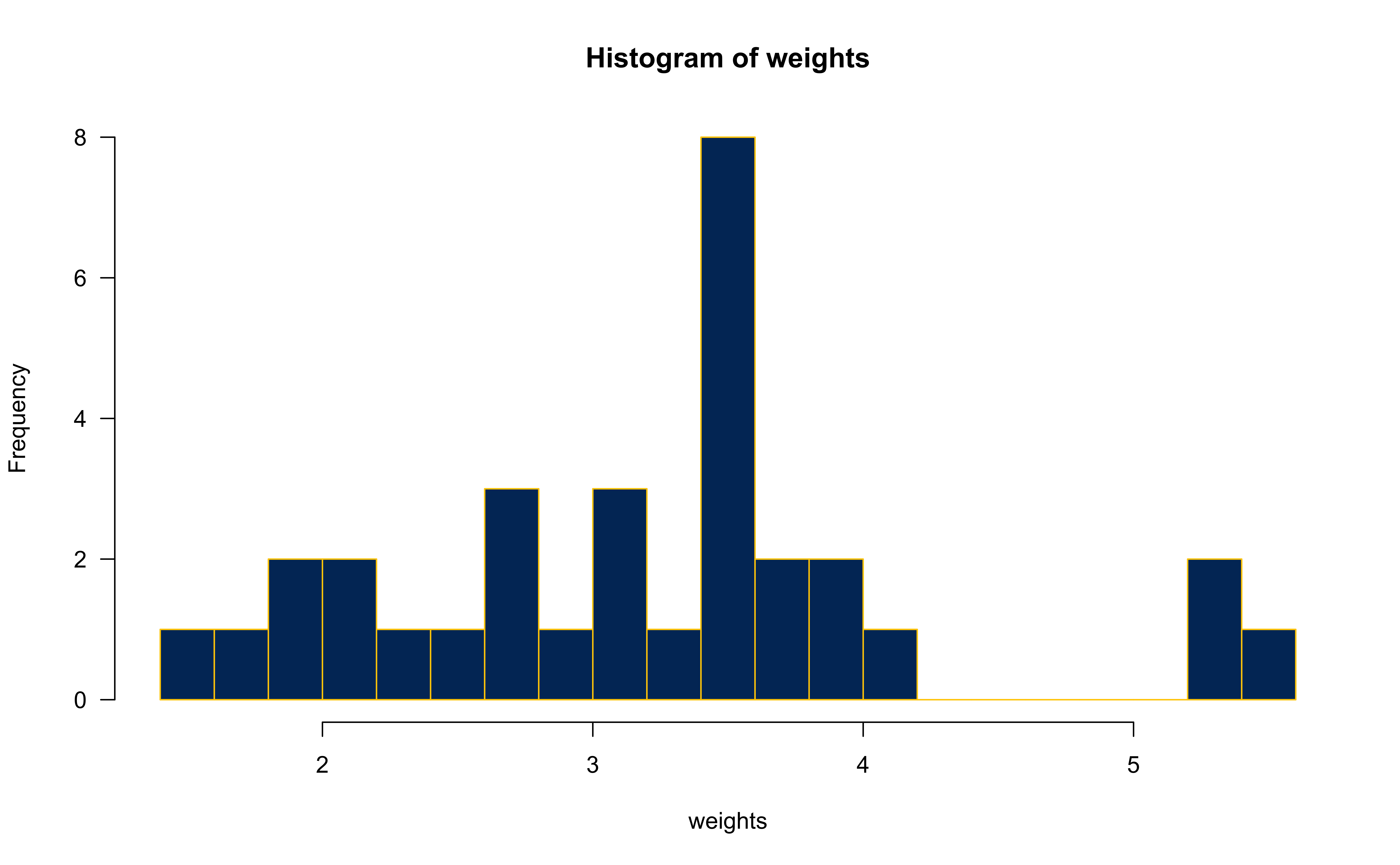 hist() decides the class intervals/with based on breaks. If not provided, R chooses one.hist(mtcars$wt,