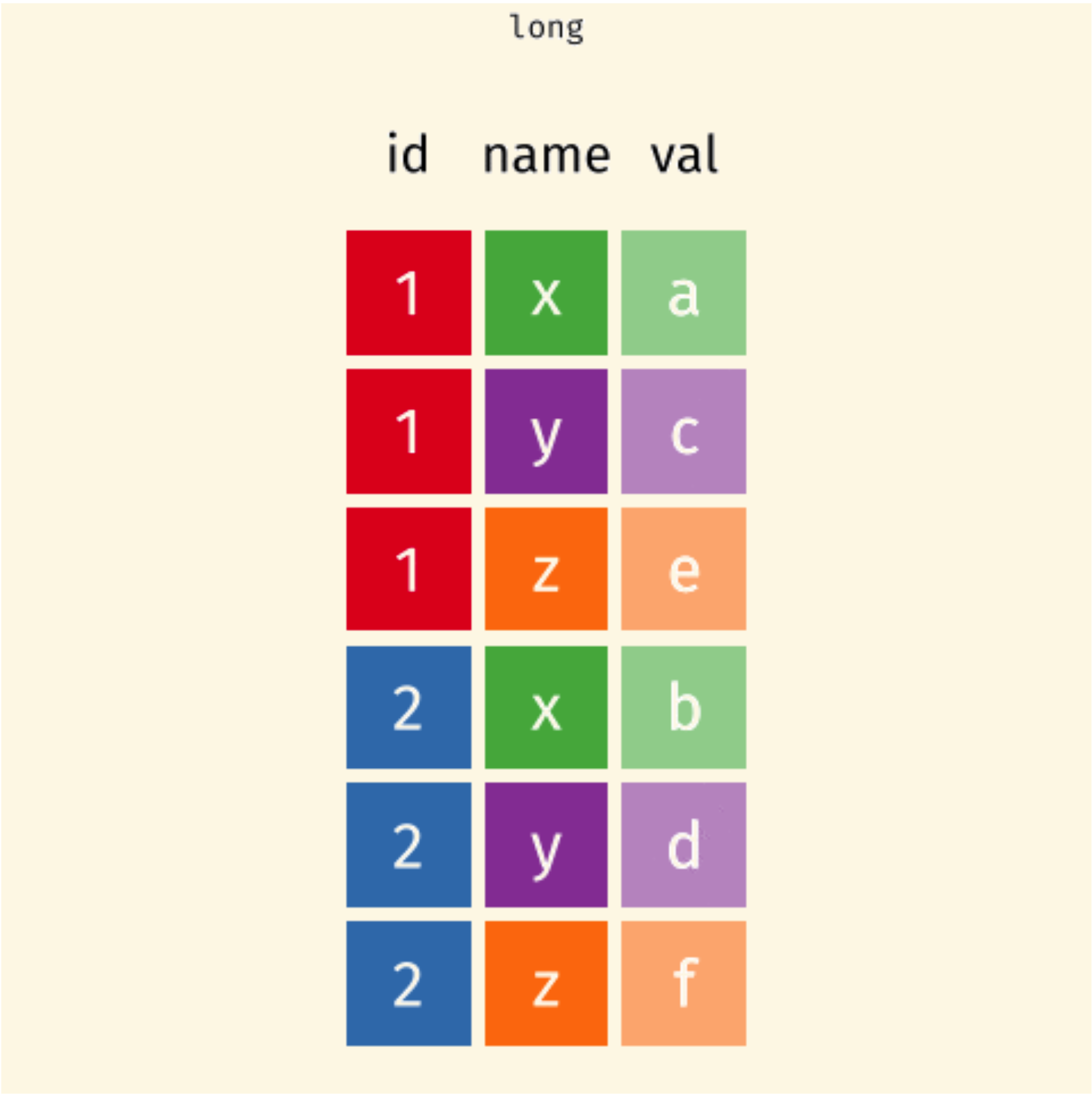 pivot_longer() ``lengthens” data, adding more rows and decreasing the number of columns.