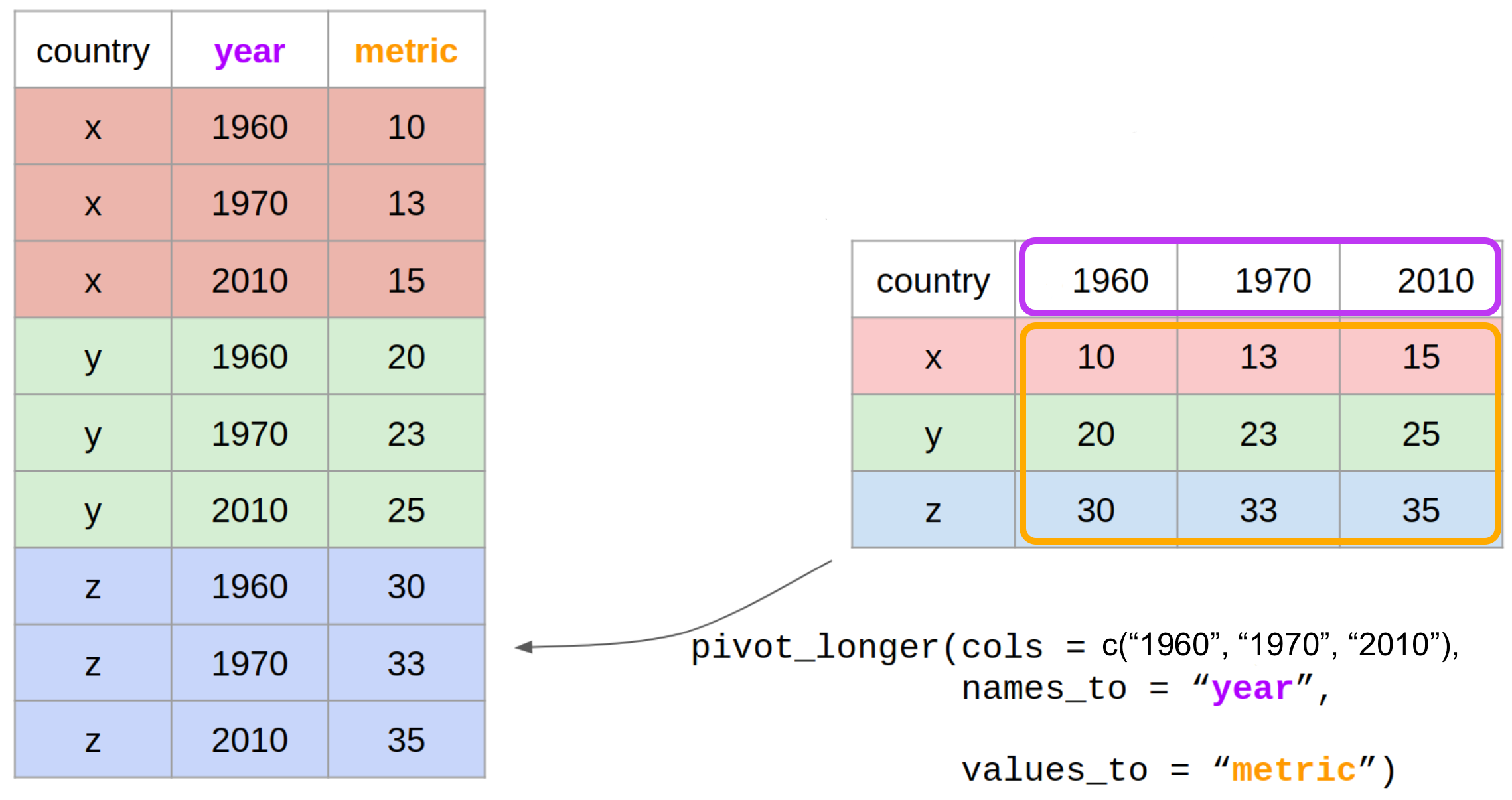 pivot_longer()values_to: name of the column where data values in pivoted variables go (metric)